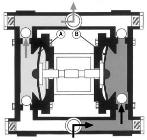 Chu kỳ 1 – Khí nén được bơm vào mặt sau của màng A đẩy chất lỏng theo hướng ra ngoài họng xả. Nó đồng thời kéo màng B với trục, do đó tạo ra lực hút ứng chân không hút chất lỏng vào từ họng hút.