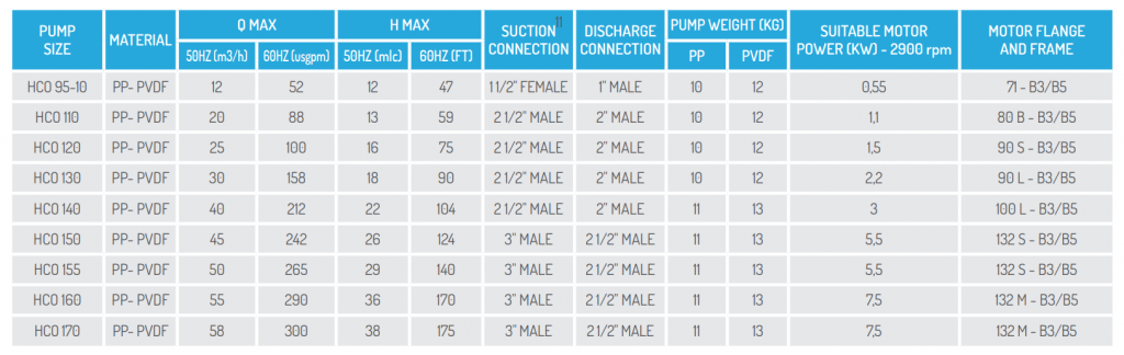Máy bơm ly tâm dòng HCO với phớt cơ học được làm bằng vật liệu nhựa (Polypropylene và PVDF) và phù hợp với chất lỏng ăn mòn cao có chứa chất rắn trong hệ thống treo. Phớt của máy bơm HCO kích thước 95-10 được đảm bảo bởi một con dấu môi elastomeric đặc biệt, trong khi tất cả các kích thước khác (từ kích thước 110 đến 170) được trang bị một phớt cơ khí PTFE bên trong (sic / gốm).