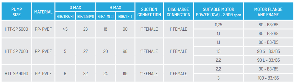 Bơm HTT-SP có thể hút sâu hơn 5 m với nước ở nhiệt độ môi trường bình thường. Vỏ được làm nguyên khối PP và cánh quạt trong PVDF cho khả năng kháng hóa chất tối đa. Vỏ được gia công nguyên khối. Cánh quạt trong PVDF tự cân bằng để loại bỏ hao mòn ổ trục lực đẩy và nó tách biệt để giảm thiểu chi phí bảo trì. Loại bơm này cung cấp sức đề kháng tối đa chịu được sự ăn mòn bên ngoài. Nó xử lý tới 20% khí bị hao hụt và chống ăn mòn.