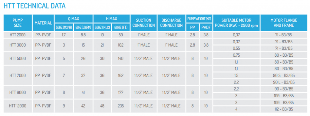 Dòng máy bơm tuabin dẫn động từ HTT được làm bằng vật liệu nhựa nhiệt dẻo (polypropylene-PP và PVDF) và phù hợp để bơm chất lỏng ăn mòn cao. Nhờ hệ thống truyền động mag sáng tạo, mô hình máy bơm HTT giảm nguy cơ rò rỉ và khí thải và chi phí bảo trì. Việc truyền chuyển động xảy ra thông qua các khớp từ tính mà không có bất kỳ con dấu cơ học nào. Thiết kế này đảm bảo sự an toàn và hiệu quả tối đa. Chất lỏng bơm phải sạch và không có chất rắn trong hệ thống treo.