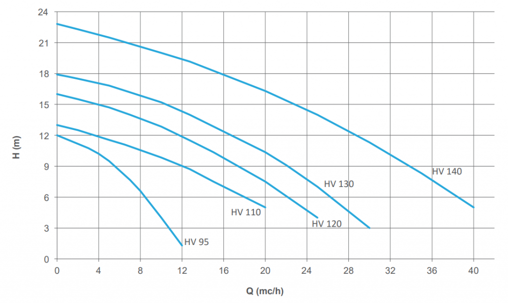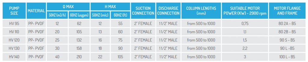 Dòng máy bơm ly tâm trục đứng HV được làm bằng vật liệu nhựa nhiệt dẻo (PP và PVDF) và phù hợp với chất lỏng ăn mòn cao có chứa lẫn cặn rắn. Những máy bơm thẳng đứng này có thể truyền hóa chất lên đến công suất 40 m3/h và với cột áp tối đa là 22 m. Dòng máy bơm HV có sẵn với chiều dài thân bơm phù hợp cho nhiều nhu cầu bơm từ 500 mm đến 1000 mm.