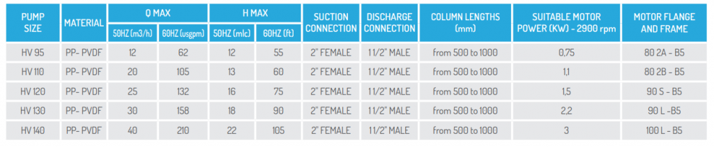 Bơm ly tâm trục đứng HVL series được làm bằng vật liệu nhựa nhiệt dẻo (PP và PVDF) và phù hợp để bơm chất lỏng ăn mòn cao với lẫn cặn. Bơm trục đứng này có thể truyền hóa chất lên đến công suất 57 m3 / h và cột áp tối đa 39 m. Dòng bơm HVL có sẵn với chiều dài cột khác nhau từ 500 mm đến 2000mm.